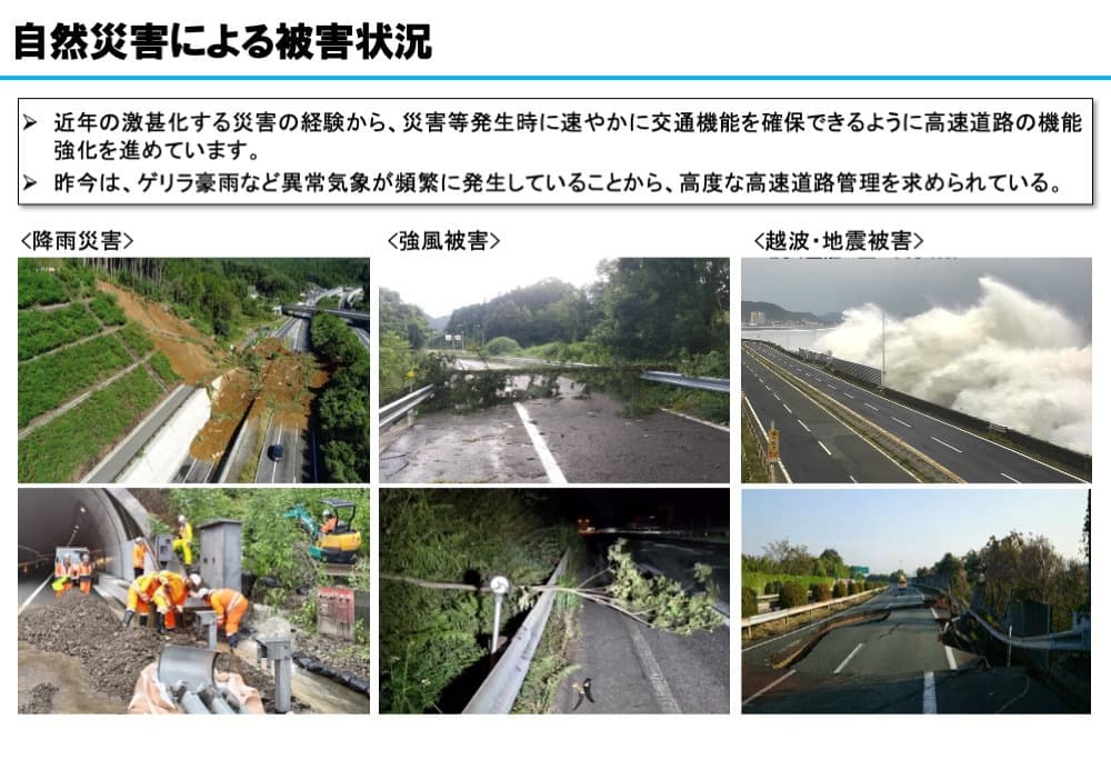 | 高速道路の モビリティマネジメント | ・全線常時監視による現場状況把握の効率化 ・移動体監視による路面状況等把握の効率化 |